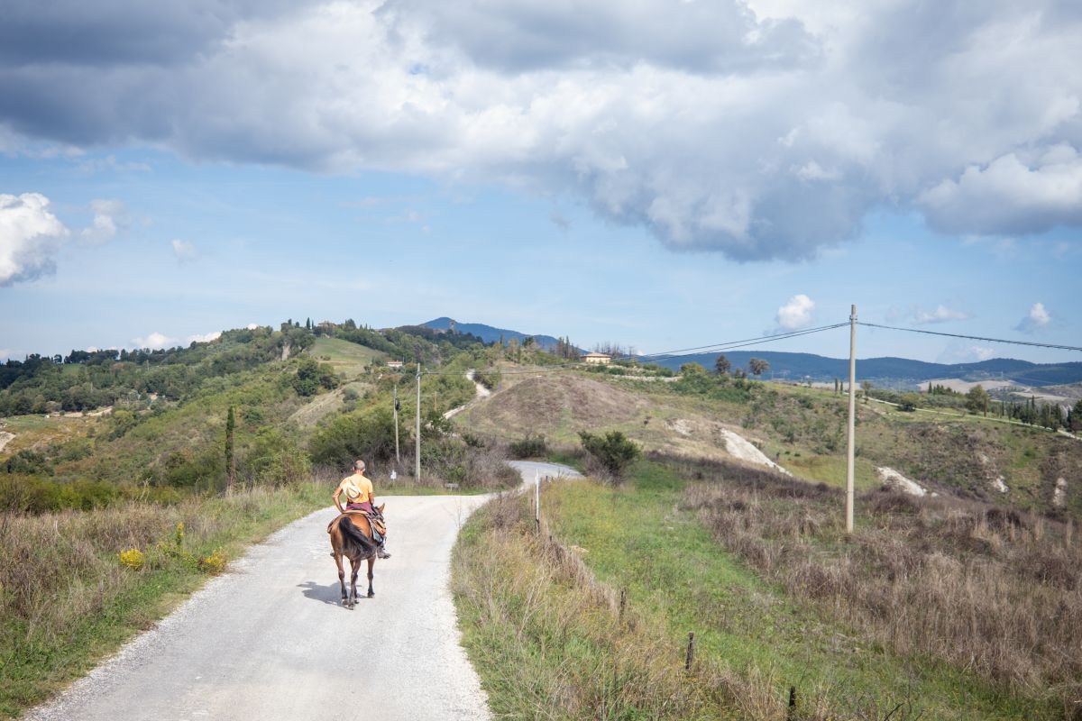 Jour 3 : Après le petit déjeuner, vous partirez vers le nord. Après 3-4 heures en selle, vous atteindrez à nouveau le vaste paysage vallonné de Sienne. Vous traverserez des rivières et suivrez une crête avec une vue à 360°. À l'ombre d'une impressionnante paroi rocheuse, vous pique-niquez en contemplant le lointain Radicofani, votre destination du jour. En chemin, vous passerez par le village médiéval de Celle sul Rigo, qui est resté inchangé. À Radicofano, une ville fortifiée d'importance historique, votre hôte Antonello vous attendra. Vous profiterez d'un festin exceptionnel, avec du gibier frais et des gâteaux faits maison. Nuitée dans l'agréable pension d'Antonello avec piscine.