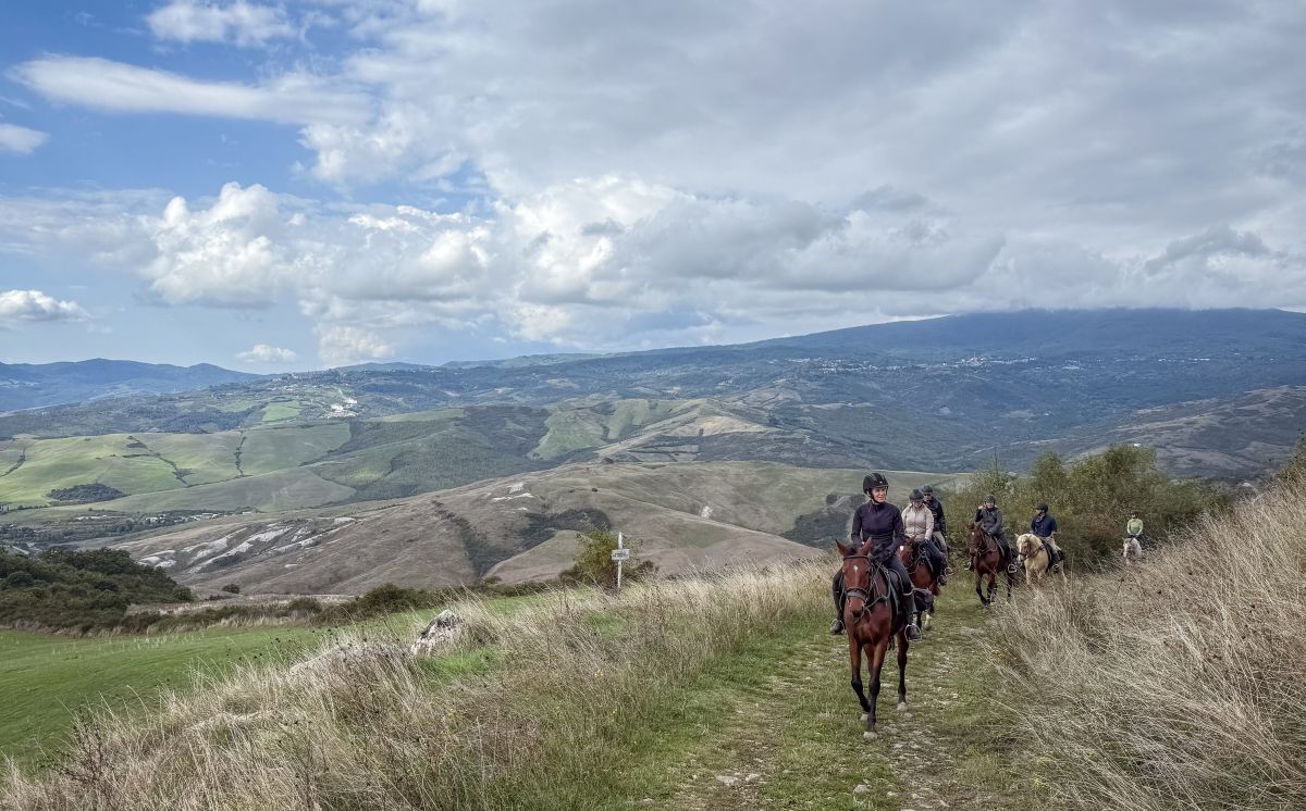 Jour 3 : Après le petit déjeuner, vous partirez vers le nord. Après 3-4 heures en selle, vous atteindrez à nouveau le vaste paysage vallonné de Sienne. Vous traverserez des rivières et suivrez une crête avec une vue à 360°. À l'ombre d'une impressionnante paroi rocheuse, vous pique-niquez en contemplant le lointain Radicofani, votre destination du jour. En chemin, vous passerez par le village médiéval de Celle sul Rigo, qui est resté inchangé. À Radicofano, une ville fortifiée d'importance historique, votre hôte Antonello vous attendra. Vous profiterez d'un festin exceptionnel, avec du gibier frais et des gâteaux faits maison. Nuitée dans l'agréable pension d'Antonello avec piscine.